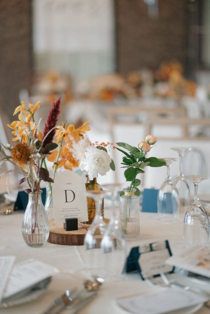 落ち着いた色味の装花や手作りのペーパーアイテムで