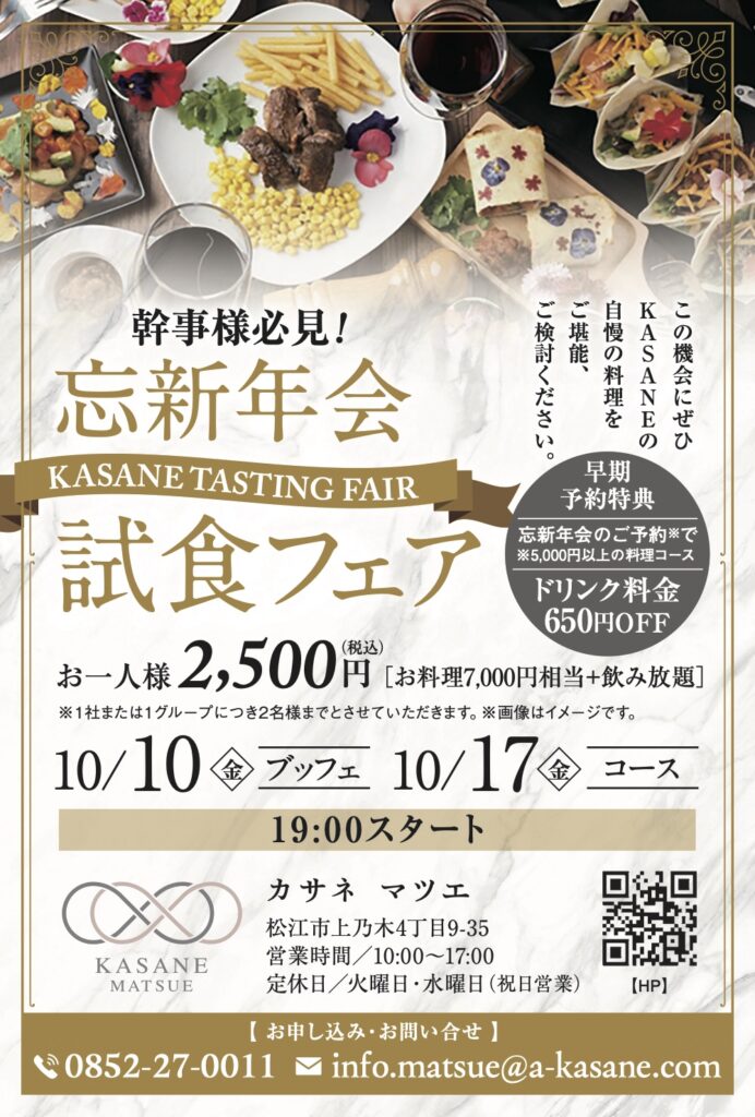 幹事さま向け、KASANEの忘年会・新年会料理の試食フェアを開催します。