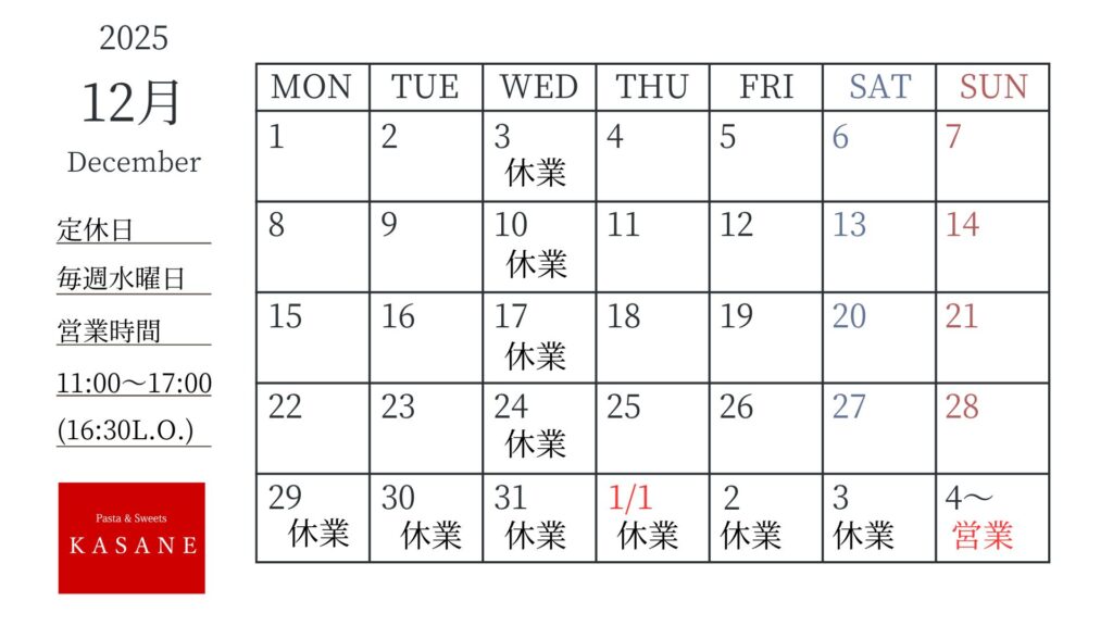 12月の営業カレンダーです。